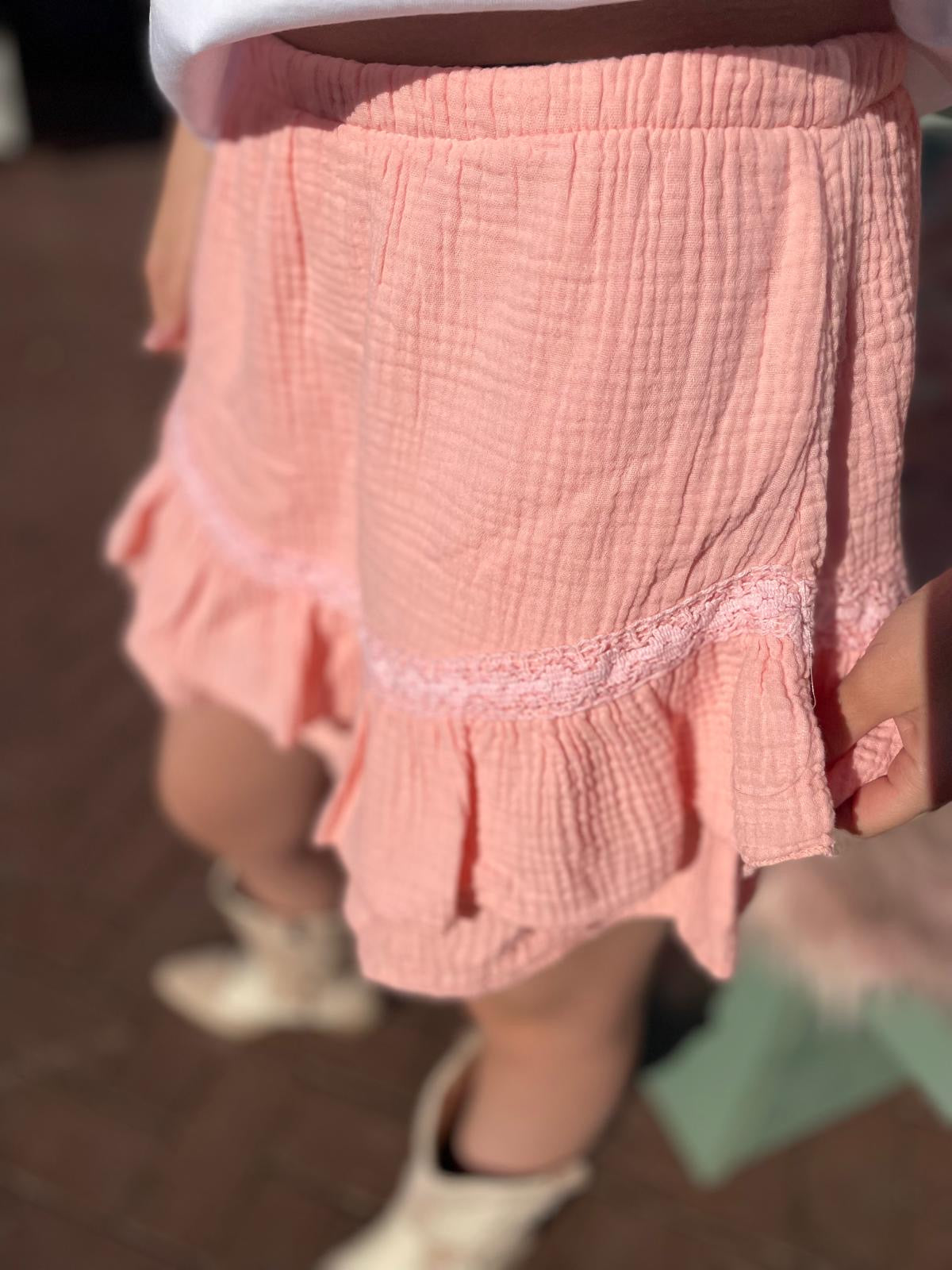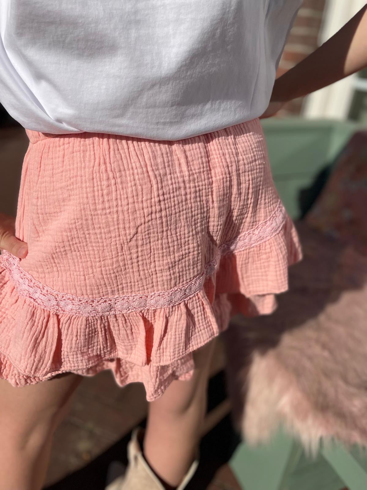 Vrouwelijk rokje in roze tint, elegant en veelzijdig te combineren.